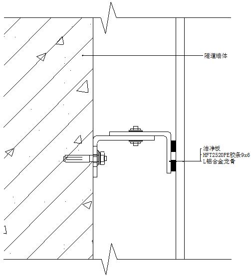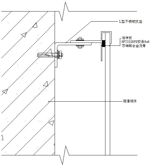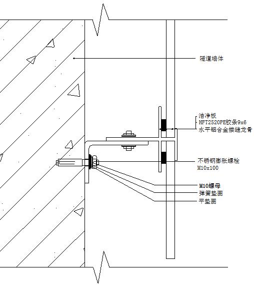 根據(jù)設(shè)計圖紙,在隧道側(cè)墻壁上彈線,定位;定出各龍骨在支座上的連接點。在定好位置的地方用不銹鋼膨脹螺栓(M10×100)把支座連接在墻上,固定時應(yīng)保證支座水平。(注意:設(shè)計圖紙上固定支座的定位,只是一般規(guī)則性的定位,未考慮接縫的誤差,龍骨接縫的誤差以及施工中的誤差,因此在施工中可根據(jù)實際情況,在作適當(dāng)?shù)恼{(diào)整。)