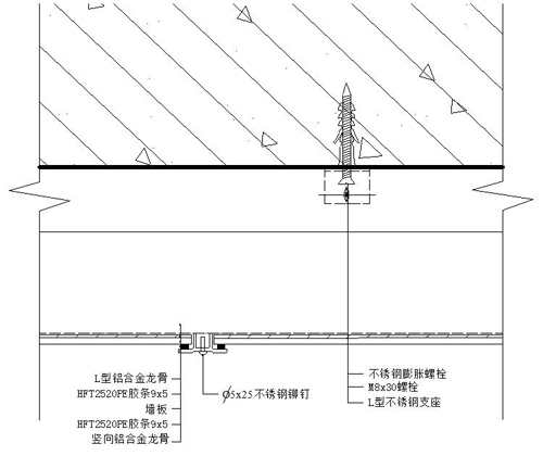 2)確認(rèn)好距離后,在豎向鋁合金龍骨的兩翼內(nèi)側(cè)粘貼PE(9×5mm)膠條,將其粘接在板面上,,再用不銹鋼鉚釘(Φ5×25mm)將其固定在L型鋁合金龍骨上。